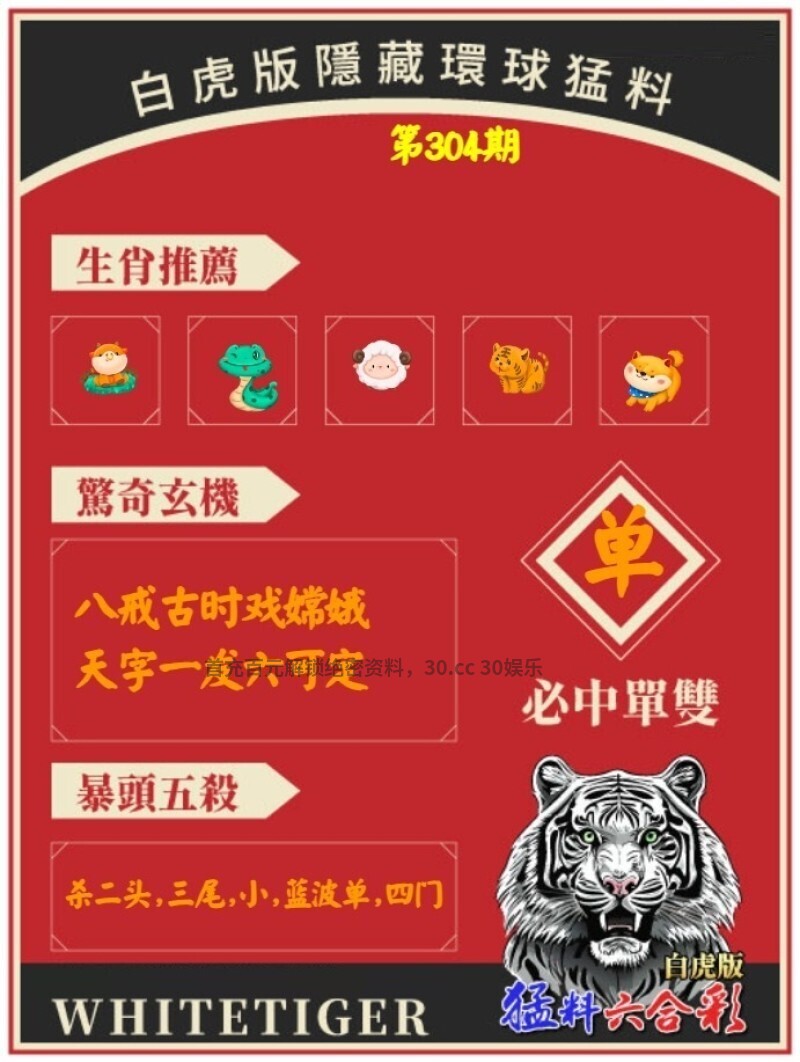 304期:白虎环球猛料 开:马48对 八戒古时戏嫦娥,天字一发六可定 解释:八戒古时戏嫦娥,天字一发六可定,解牛猴兔虎 九肖:牛猴兔虎鸡马狗猪蛇 |