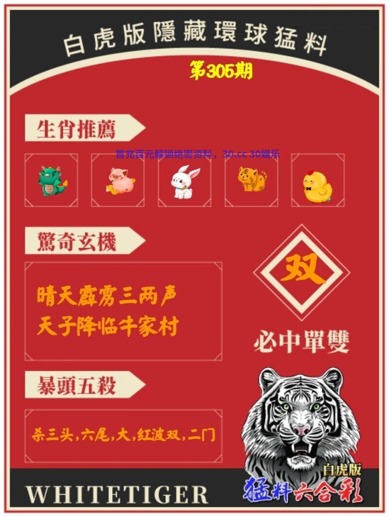 305期:白虎环球猛料 开:鼠42对 晴天露雳三两声,天子降临牛家村 解释:晴天露雳三两声,天子降临牛家村,解猪鸡羊鼠 九肖:猪鸡羊鼠狗龙虎马猴 |