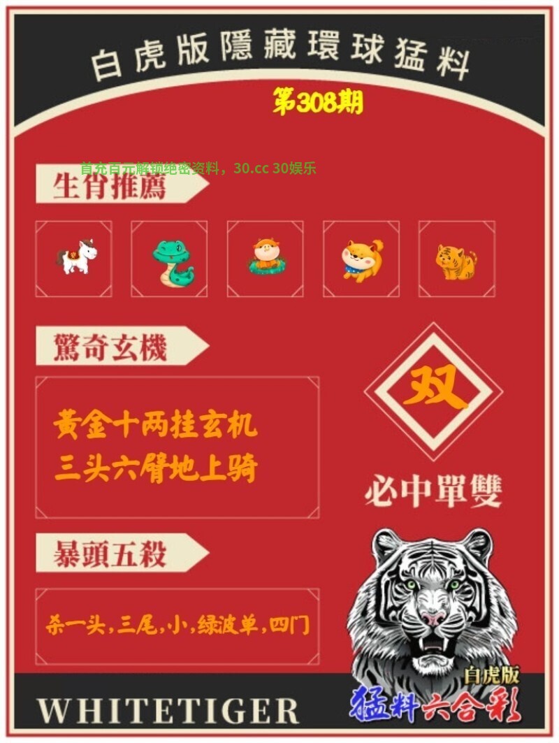308期:白虎环球猛料 开:兔39对 黃金十两挂玄机,三头六臂地上骑 解释:黃金十两挂玄机,三头六臂地上骑,解牛蛇鸡虎 九肖:牛蛇鸡虎猴猪鼠兔狗 |